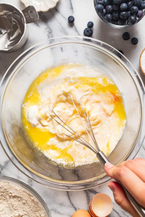 - In a large glass measuring cup or another bowl, whisk together milk, sour cream, eggs and melted butter. Pour mixture over dry ingredients and stir using a rubber spatula just until moist.
