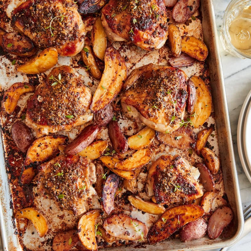- Using paper towels, pat chicken dry. Place chicken in a single layer around the potatoes on the prepared baking sheet. Spread Dijon mixture evenly over the chicken; season with salt and pepper, to taste.