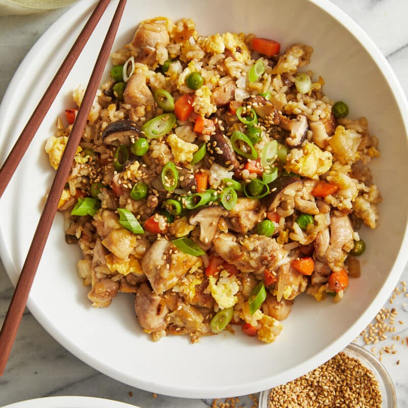 Comes together so quickly with leftover rice! Made with chicken, eggs, vegetables and white or brown rice. SO GOOD.