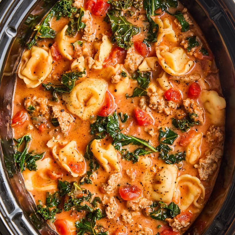 It has been a very cold winter, and we are in dire need of some cozy, comforting goodness to warm us from the inside out right now. And this set-and-forget slow cooker tortellini soup really has it all – from crumbled Italian sausage to soft, pillowy three-cheese tortellini to sneaked-in leafy greens in the most velvety, creamy, tomato-brothy goodness. And the tortellini cooks oh-so-perfectly right in the crockpot.