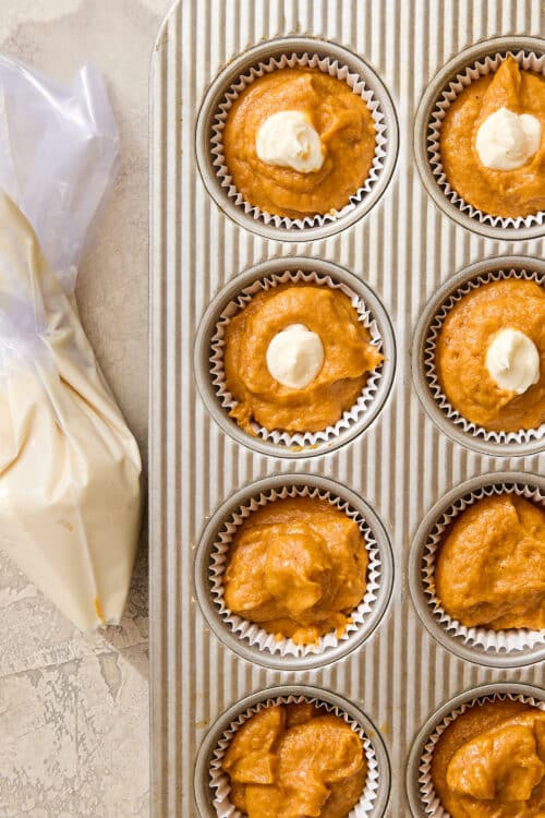 - Cream cheese filling. Use room temperature cream cheese, and mix everything together until smooth, adding to a piping bag or Ziploc bag with the corner snipped off. Fill in the center of each muffin, dipping the piping bag or Ziploc bag into the batter + releasing, and bake until perfectly golden brown.