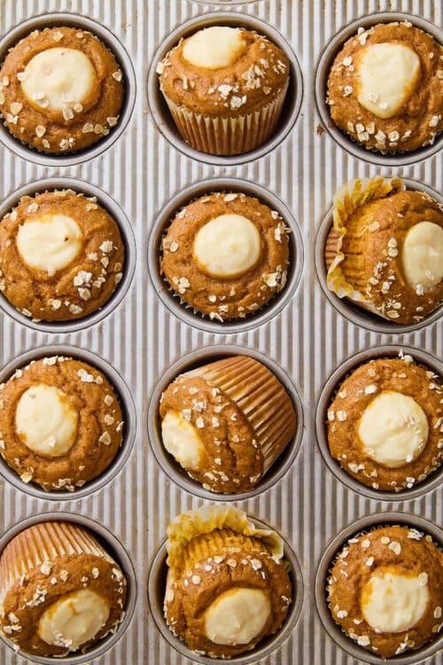 - Squeeze about 2 tablespoons cream cheese filling into the center of each muffin, leaving a dollop on the top; sprinkle with rolled oats around the filling, if desired.